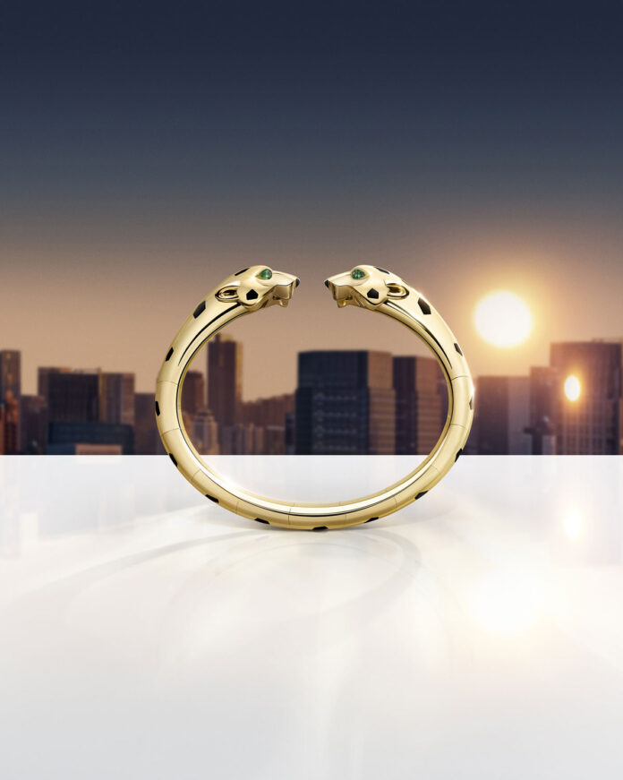 Con la Panthère articulada, caracterizada por sus líneas depuradas y su diseño preciso, Cartier ha cultivado la sencillez joyera: una pulsera de oro amarillo con manchas octogonales de laca negra o de oro blanco con pavé de diamantes y engastado con manchas de ónix. La joya curvilínea se prolonga con dos esculturales cabezas de pantera enfrentadas con ojos de esmeraldas o granates tsavoritas.