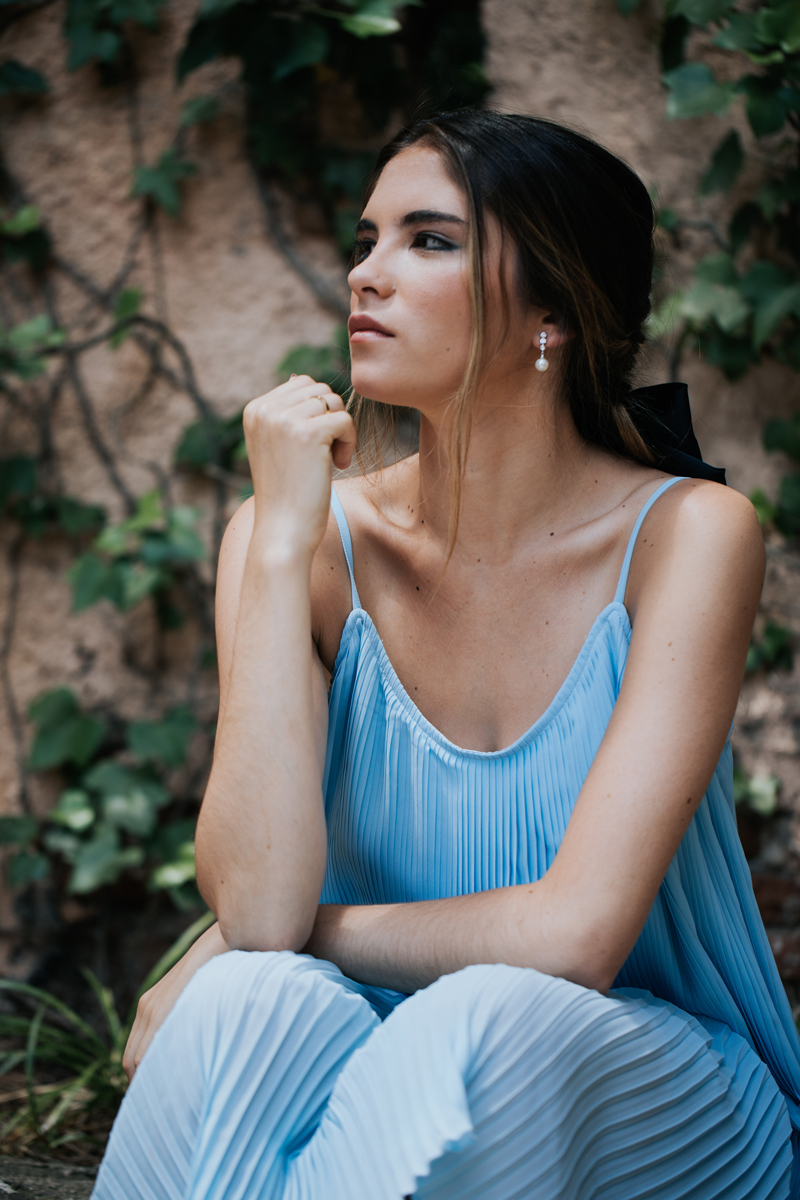 La fluidez de un vestido perfecto para una boda de verano en un look que se olvida del blanco para dar paso a un azul pastel, creando dos contrastes importantes: por un lado, las nuevas tendencias a la hora de vestir a la novia y, por otro, la tradición de ese «algo azul» trasladado al estilismo, en lugar de solo a un único detalle.