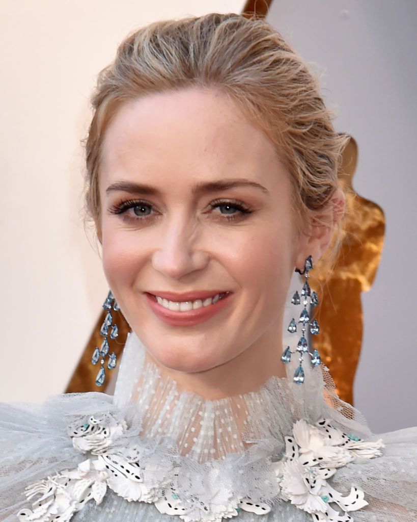 El estilo romántico tampoco podía faltar en esta alfombra roja. Emily Blunt lo demuestra con un vestido plumero en celeste grisáceo, de Schiaparelli Haute Couture y combinado con joyas de Chopard.