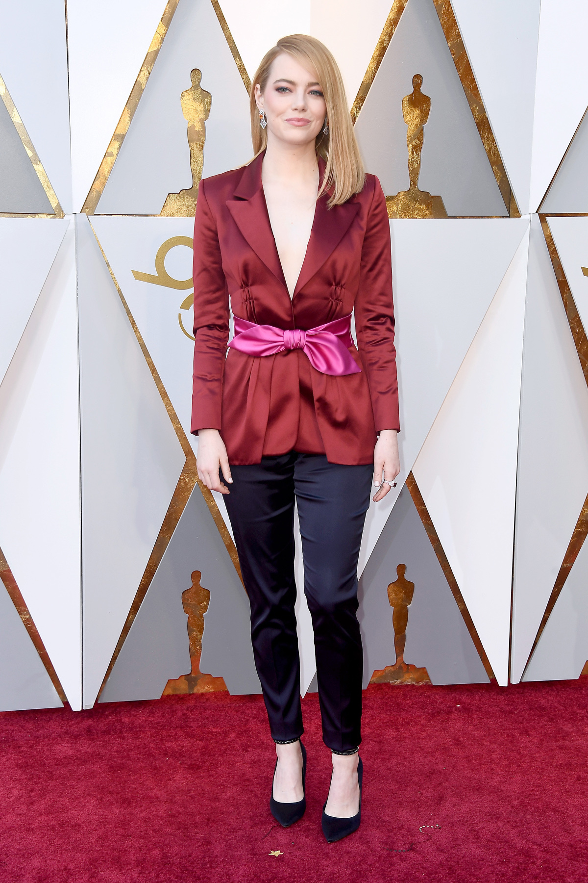 La otra sorpresa: el look de pantalones absolutamente brillante. Tres piezas contrastadas de satén, firmadas por Louis Vuitton, hechas para subrayar el poder de la ganadora del Oscar del año pasado.