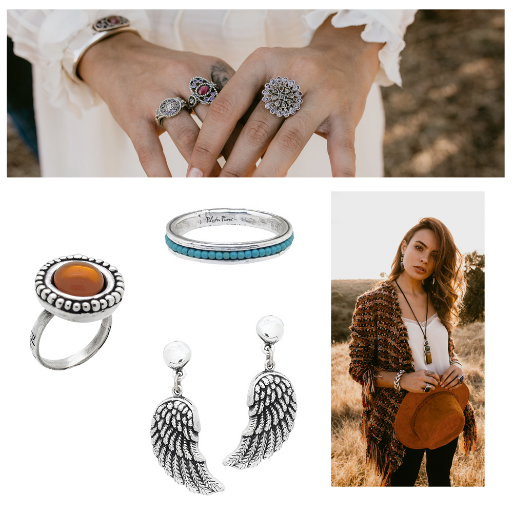 Las primeras colecciones estuvieron enfocadas a pulseras de cuero con entrepiezas de plata y piedras, pendientes largos y anillos voluminosos. Para esta temporada, Plata Pura apuesta por colgantes de gran tamaño con anillos y pendientes a juego.