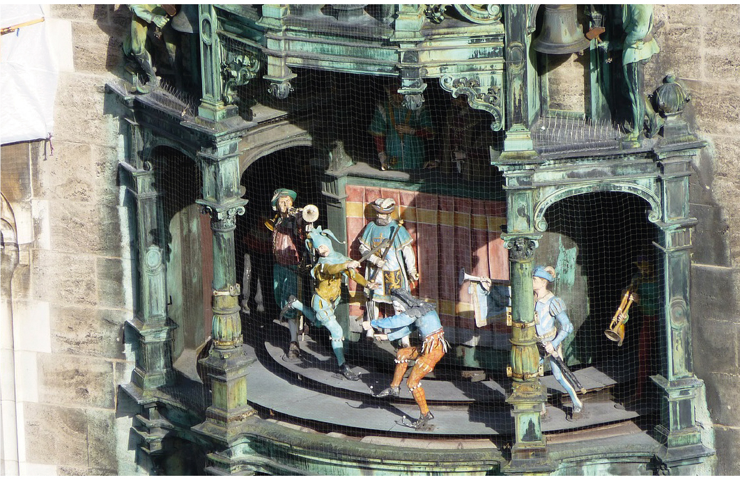 Ubicado en Marienplatz, dispone de 43 campanas y 32 figuras de tamaño real que, dos veces al día, representan para el público, en dos niveles, la historia matrimonial del duque Wilhelm V y Renata de Lorena y la danza de los toneleros.