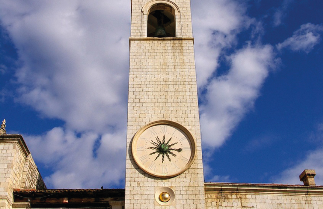 A 31 metros de altura, en la torre blanca de la Plaza de la Luza, reconstruida tras los terremotos, se encuentra este reloj en los que dos “zelendi”, estatuas de bronce de soldados romanos, golpean a diario la campana para avisar del cambio de hora.