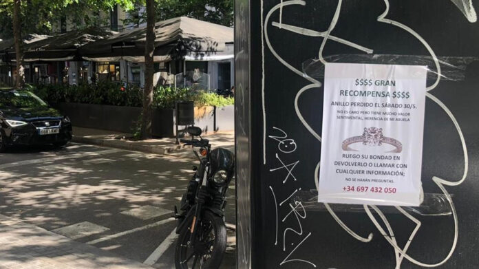 «Recompensa $$$$ Anillo perdido el sábado 30/5. No es caro pero tiene mucho valor sentimental. Herencia de mi abuela. Ruego su bondad en devolverlo o llamar con cualquier información; no se harán preguntas +34 697 432 050″ . Una pareja colgaba un cartel en el centro de Barcelona con este texto, después de que ella perdiera su anillo de compromiso. Pide ayude a la ciudad entera.