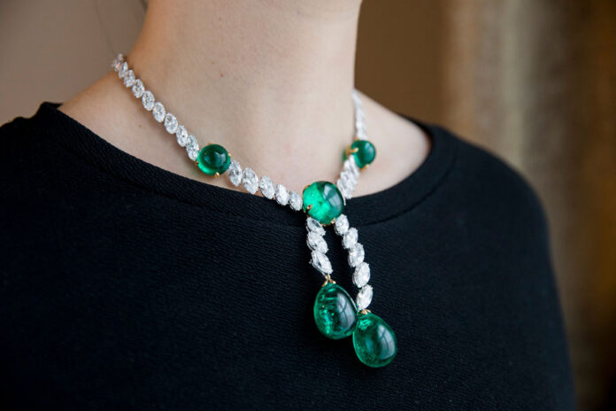 Este impresionante par de pendientes de diamantes y esmeraldas colombianas de Harry Winston es muy evocador de las joyas de los años 70. Además, formó parte de la colección de Su Alteza la Princesa Salimah Aga Khan. Los pendientes están engastados con esmeraldas cabujón con un peso de 11.33 y 11.94 quilates respectivamente y unas gotas de esmeraldas que llegan hasta los 21.64 y 22.29 quilates cada una. (Estimación $1,500,000 – 2,500,000).