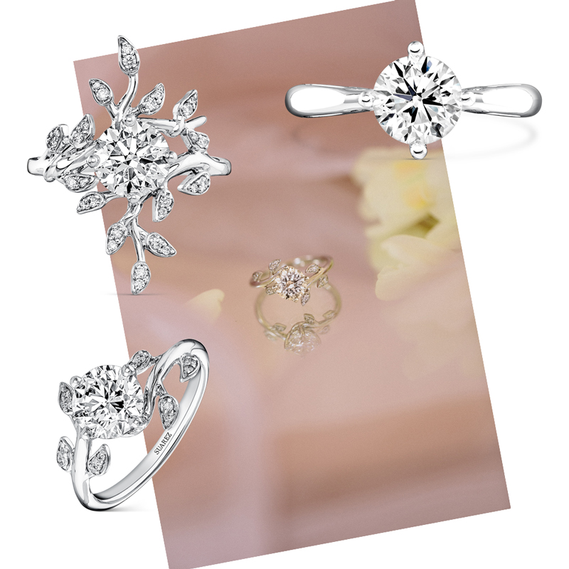 Tres centros de diamante de 1,5 quilates componen estas tres joyas reinventadas. Las piedras han sido rigurosamente seleccionadas por Suarez, en una búsqueda de diamantes verdaderamente excepcionales.
