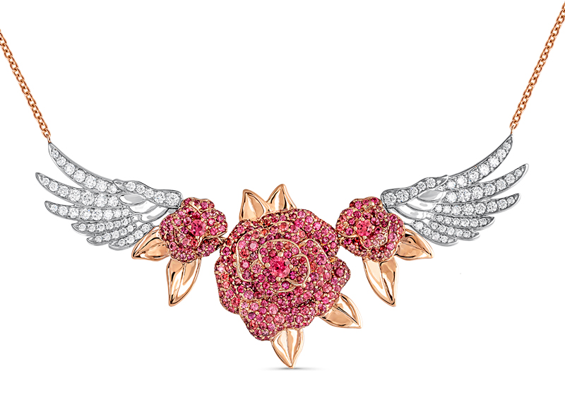 Estas joyas de estética fantástica cuentan con rubíes, zafiros multicolor y turmalinas, muchas de ellas en talla corazón. Piedras como la turmalina verde talla corazón de 12 quilates protagonista del colgante con forma de Sagrado Corazón, una joya única de gran valor.