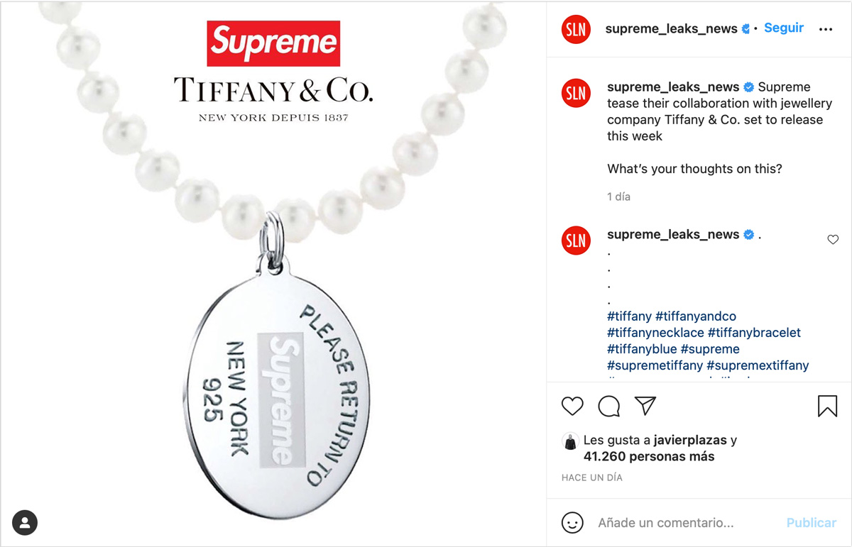 Hacía semanas que este rumor corría por las redes sociales y hasta hoy solo era eso, un rumor. Ahora ya es una realidad puesto que ambas compañías han anunciado su colaboración a través de unas publicaciones en sus redes sociales, así como la fecha de lanzamiento: 11/11/2021. Las primeras imágenes muestran, en un vídeo, al conocido Sean Pablo con un un collar de perlas y un charm con el típico grabado «Please Return to Tiffany & Co», así como el logo de Supreme; y, como era de esperar, la marca de joyería vuelve a romper con todas las reglas. Hace apenas unos minutos, ambas compañías han publicado más contenido, en el que se puede ver la colección cápsula al completo.