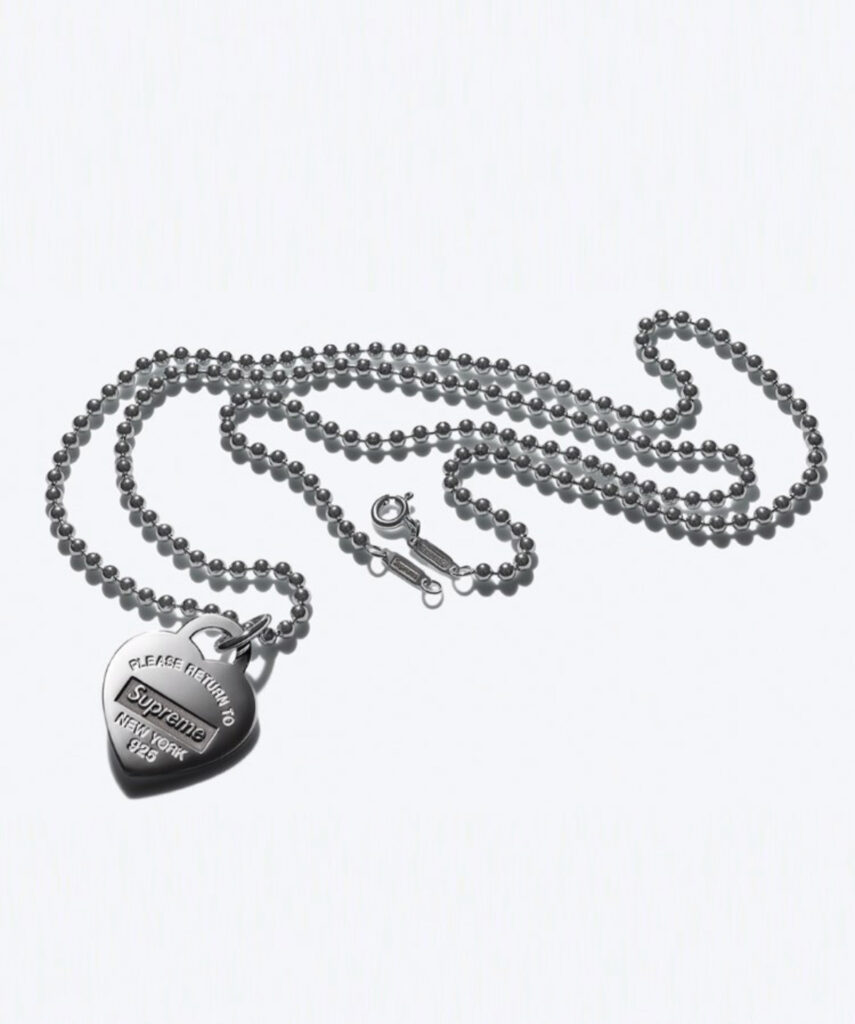 La cápsula, que estará formada por “joyería, accesorios y más”, y que Tiffany & Co ya ha anunciado en sus redes sociales, incluye collares de plata, un collar de perlas, una pulsera de estrellas con el nombre de Supreme, los típicos pendientes en forma de corazón, una llave navaja e incluso una camiseta.