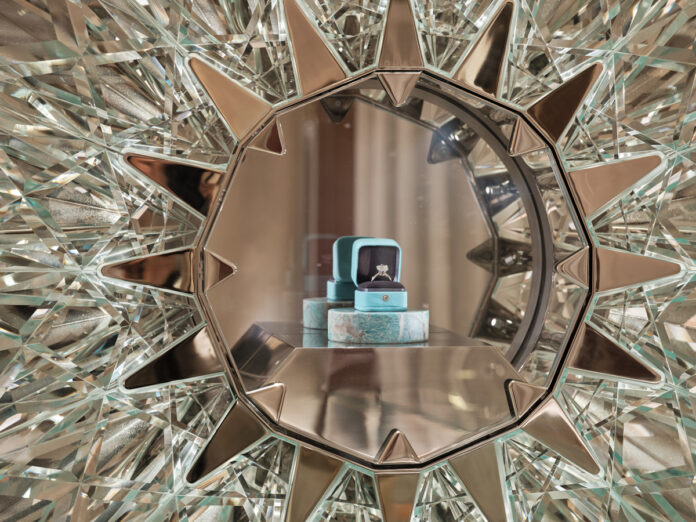 El mundo de Tiffany se representa con elegancia en un ambiente cálido gracias a la omnipresencia de las suaves curvas de su arquitectura, las paredes curvilíneas y los tonos pastel de las sillas y las alfombras, que ayudan a crear una atmósfera íntima y relajante. Un gran lámpara inspirada en los legendarios diamantes y piedras preciosas de Tiffany sirve como elemento central visto desde la entrada. Los radiantes diamantes de Tiffany, los legendarios solitarios de compromiso, los diseños de Elsa Peretti® y las colecciones icónicas, entre las que se encuentran Tiffany T1, Tiffany Knot, Victoria o Tiffany City HardWear son algunas de las joyas que serán expuestas en esta tienda.