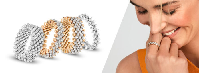 Wempe presenta la sortija Multisize de Serafino Consoli, una joya que no deja indiferente ya que permite cambiar y adaptar el tamaño de la sortija de forma sorprendentemente sencilla e intuitiva. Una estructura de rejilla extensible, que está compuesta por cientos de piezas y miles de puntos de soldadura por láser, permite ajustar la joya en un movimiento fluido y suave. En un abrir y cerrar de ojos, se puede extender la sortija al tamaño deseado y llevarla en cualquiera de los dedos de la mano. No es magia, pero sí es un momento mágico cuando una sortija cambia de manera tan sencilla su talla. Con los anillos Multisize esta idea se ha hecho realidad.